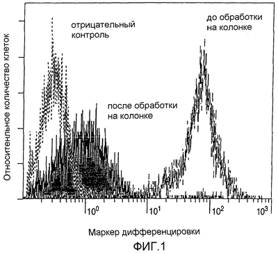 На Фиг.1 показаны графики проточной цитометрии для популяции клеток, полученных из костного мозга мыши, в которые с помощью StemSepTM вводят метку смеси анти-Lin-антител. График "до обработки на колонке" показывает анализируемые результаты для популяции клеток, которые не проходили обработку на колонке MACS LS+; а график "после обработки на колонке" показывает анализируемые результаты для популяции клеток, которые проходили обработку на колонке. Очевидно, что обработка с помощью StemSepTM дает маркер дифференцировки Lin-отрицательных или слабоположительных клеток.